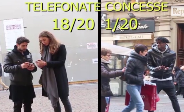 Attenzione, i bianchi sono più volemose bene con i bianchi, i neri sono più volemose bene con i neri e con Allah non si scherza un corno. Qualche giorno fa lo youtuber Kiko.Co – dopo essersi cimentato in video come “Omofobia” (registrando i commenti delle persone davanti a due maschi che pomiciano duro tra la folla) o “Ipocrisia” (travestito da bisognoso a cui non tutti i passanti elargiscono i 5 euro ricevuti dai suoi complici per promuovere una giornata contro la povertà) –, ha condotto un nuovo esperimento sociale a Milano. Fingendo di avere il cellulare scarico, lui e un complice di colore hanno iniziato a fermare i passanti chiedendo loro: “Mi presti il telefonino? Devo fare urgentemente una chiamata”. Morale? La spiega Repubblica rilanciando il video: «Il risultato fa riflettere: ragazzi bianchi si rifiutano di consegnare il proprio smartphone ai neri, ma succede anche il contrario». Urca.
