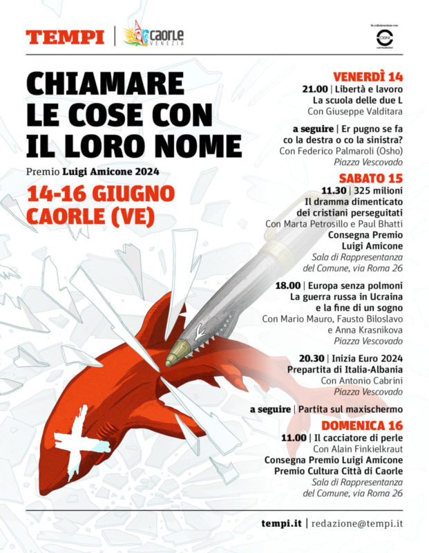 Dopo il successo delle edizioni del 2022 e 2023, anche quest’anno Tempi torna a Caorle (Venezia), da venerdì 14 a domenica 16 giugno, per il terzo appuntamento di “Chiamare le cose con il loro nome”, festival di incontri e dibattiti durante il quale verrà consegnato il Premio giornalistico Luigi Amicone e il Premio Luigi Amicone – Premio Cultura Città di Caorle.