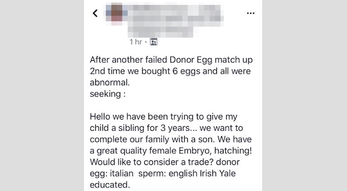 «Ciao, da tre anni stiamo provando a dare a nostro figlio un fratellino… vogliamo completare la nostra famiglia con un maschio. Abbiamo un embrione femmina di ottima qualità: ovulo di donatrice italiana e sperma anglo-irlandese, da uomo laureato a Yale. A qualcuno interessa uno scambio?». È questo il messaggio che sabato scorso, 3 novembre, Lisa ha pubblicato su un gruppo Facebook dedicato a coppie che hanno intrapreso il percorso della fecondazione assistita.