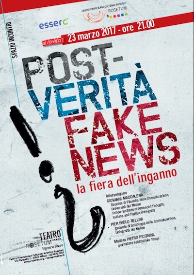 Bisogna ringraziare l’associazione culturale Esserci e il Centro culturale francescano Rosetum per avere preso l’iniziativa di proporre un incontro pubblico sul tema “Post-verità & Fake News: la fiera dell’inganno” e di invitare a parlare due docenti universitari capaci di affrontare l’argomento fuori dagli schemi rigidi della comunicazione accademica: Giovanni Maddalena, docente di filosofia della comunicazione all’università del Molise, e Pier Paolo Bellini, docente di sociologia della comunicazione della stessa università. In apertura Pietro Piccinini di Tempi ha impostato il tema, ricordando che nel novembre scorso l’Oxford Dictionary ha nominato parola dell’anno l’espressione “post-truth”, cioè post-verità, definita come termine che serve a connotare «circostanze in cui i fatti obiettivi influiscono sull’opinione pubblica meno degli appelli alle emozioni e alle convinzioni personali». Nel mondo contemporaneo, insomma, non conta più se una cosa è vera o falsa, ma se fa opinione, se è condivisa, se riesce a fare incetta di “like”. Tuttavia la scelta di “post-verità” come parola dell’anno suggerisce che sia insorto un senso di ribellione contro le conseguenze di quell’egemonia culturale che ha imposto di credere che “la verità non esiste” o che “credere in una verità porta alla violenza”. Suggerisce un sussulto di consapevolezza del fatto che se perdiamo interesse nella verità ci resta solo il sentimento, l’opinione, la voglia, il desiderio, la volontà e quella che lo scrittore Bret Easton Ellis definisce “l’economia della reputazione”: piacere diventa più importante che essere veri e affermare il vero.