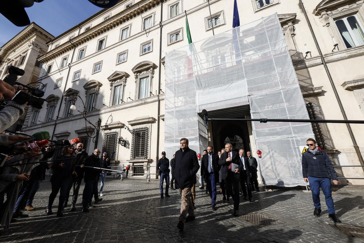Il leader di Azione, Carlo Calenda, esce da Palazzo Chigi dopo l'incontro con il premier, Giorgia Meloni (foto Ansa)