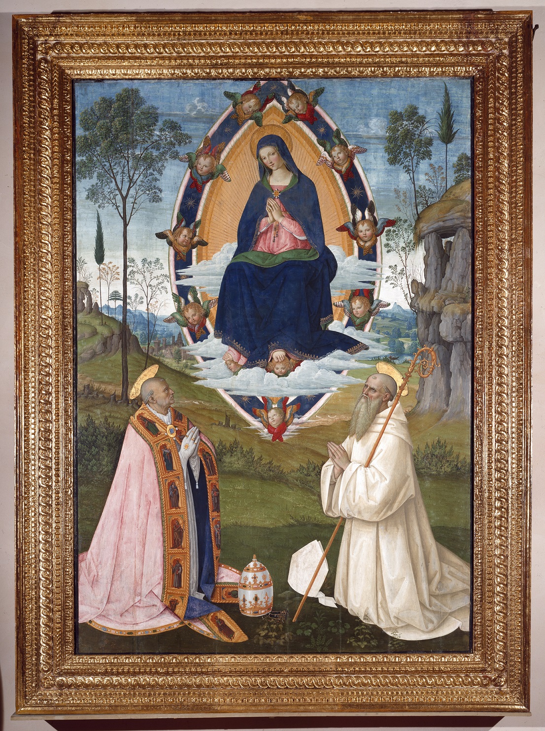 Bernardino di Betto detto il “Pintoricchio”. La Vergine Assunta tra i Santi Gregorio Magno e Benedetto. Oro, tempera su tavola. Pinacoteca civica di San Gimignano