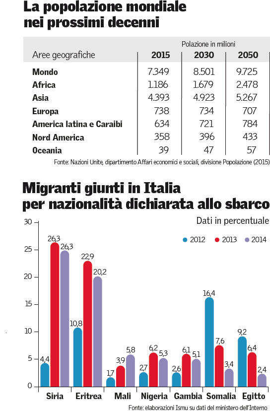 Il professor Gian Carlo Blangiardo, ordinario di Demografia all’Università di Milano Bicocca e responsabile del settore “Monitoraggio dell’immigrazione” della Fondazione Ismu – Iniziative e Studi sulla Multietnicità, nella sua analisi apparsa in prima pagina sul Sole 24 Ore di lunedì 24 agosto parte da alcuni dati di fonti diverse ma di segno uguale: dalle rilevazioni Eurostat ai conti di Frontex fino ai bilanci del Viminale, «gli indizi concordano (…), la pressione migratoria verso l’Unione Europea è continuamente in crescita». E secondo il professore, per Bruxelles e per l’Italia in particolare è tempo di occuparsi seriamente del fronte del Mediterraneo centrale, «perché se è vero che i venti di guerra che spingono le 70 mila richieste d’asilo dei siriani registrate nel complesso dell’Unione Europea nei primi sei mesi del 2015 – così come le 38 mila degli afghani o le 21 mila degli iracheni – prima o poi smetteranno di soffiare (ci si augura), non sarà la stessa cosa per il profondo Sud del Mondo». Un “bacino demografico” per cui si prospetta negli anni a venire una piena impetuosa, e che rischia di non trovare altro sfogo oltre all’Europa. Nell’Africa subsahariana, ricorda Blangiardo riprendendo le recentissime proiezioni delle Nazioni Unite, «oggi vivono 962 milioni di persone, destinate a diventare 1,2 miliardi tra dieci anni e 1,6 tra altri dieci». Di qui gli interrogativi che secondo il demografo siamo obbligati a non eludere: tutte quelle persone, di cui gran parte saranno giovani adulti in età produttiva, «troveranno sufficienti occasioni di lavoro in loco o accarezzeranno l’idea della fuga altrove?». Ma soprattutto: «Fino a che punto l’Europa del 2035, quand’anche un po’ meno affollata (10 milioni di abitanti persi in vent’anni) e decisamente meno giovane (37 milioni di 20-39enni in meno), potrà essere in grado di assorbire senza rischi di rigetto una forza d’urto come quella che andrebbe prospettandosi?».