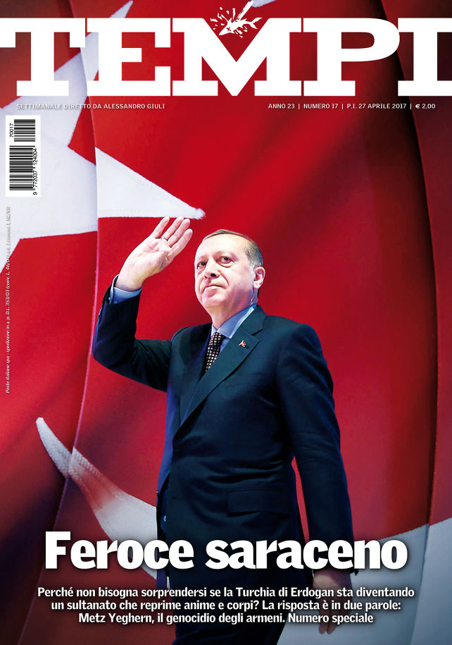 Erdogan “Feroce saraceno”. “Perché non bisogna sorprendersi se la Turchia sta diventando un sultanato che reprime anime e corpi? La risposta è in due parole: Metz Yeghern, il genocidio degli armeni”. Così Tempi presenta in copertina il suo “numero speciale” con molte pagine dedicate alla grande mostra fotografica sul genocidio armeno allestita a Milano dal 27 aprile al 24 maggio e intitolata appunto “Metz Yeghern”. All’interno del settimanale, in edicola da oggi, giovedì 27 aprile, a Milano e Roma (nelle altre città a partire da venerdì, gli abbonati possono già leggerlo e scaricarlo qui), tra i diversi articoli proposti sono ospitati anche i contribuiti di Antonia Arslan, Siobhan Nash-Marshall e Cyril Aslanov.