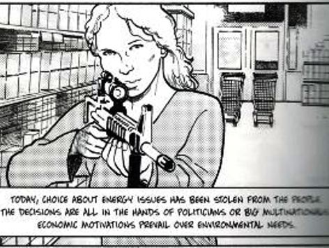 Ecco perché Camille, la compagna di Squarzoni, entra nel “Nuclear Power Christmas Market” aggirandosi tra le corsie con un fucile da assalto in spalla. Camille è pronta a vendicarsi perché «oggi, il popolo è stato derubato della possibilità di scegliere sui temi energetici. Le decisioni sono nelle mani di politici o grandi multinazionali».