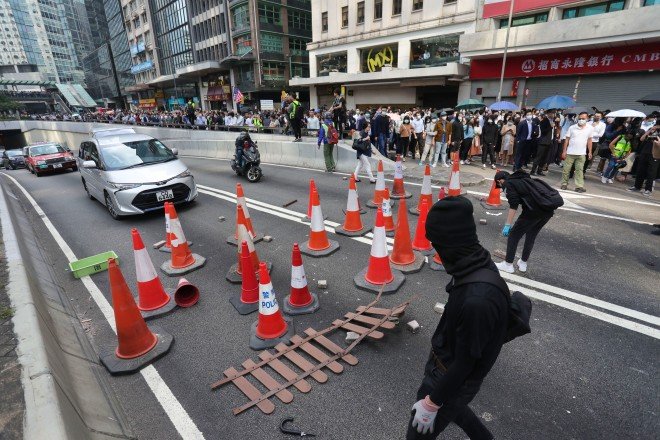 Alcune delle strade principali del distretto finanziario di Hong Kong, Central, sono state bloccate con barricate improvvisate sotto gli occhi di centinaia di dipendenti dei colossi finanziari favorevoli agli studenti