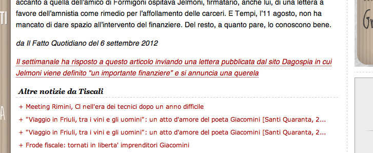 Per quel che riguarda l’articolo on line del Fatto facciamo notare ai nostri lettori che il titolo è stato modificato (“Il finanziatore del settimanale ciellino Tempi? E’ ai domiciliari per riciclaggio”). E che in un corsivo a fondo articolo c’è scritto: «Il settimanale ha risposto a questo articolo inviando una lettera pubblicata dal sito Dagospia in cui Jelmoni viene definito “un importante finanziere” e si annuncia querela».