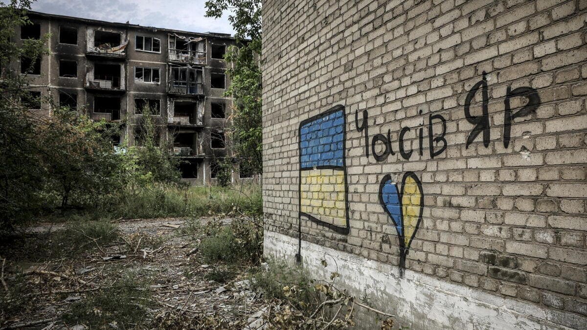 La scritta "Chasiv Yar" di fianco a una bandiera dell'Ucraina, disegnata su un muro della città del Donbass conquistata per metà dai russi (Ansa)
