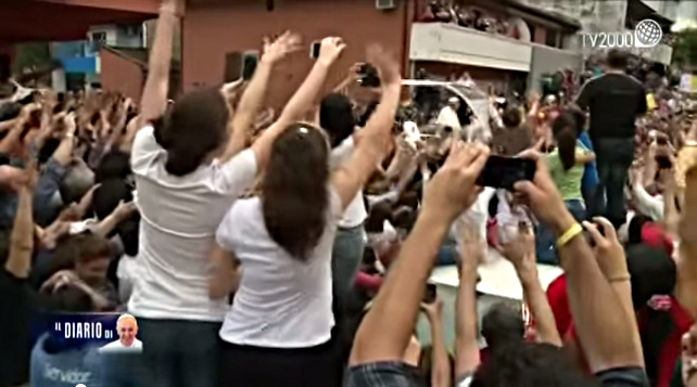 Già molte ore prima del suo arrivo, la strada, gli alberi, i balconi e perfino i tetti delle case prospicienti la clinica erano stipati di giovani che aspettavano il Papa. Entusiasmo alle stelle. I bambini della scuola Pa’i Alberto e i ragazzi della scuola professionale Pa’i Lino, tutti con la divisa di gala, hanno formato due cordoni per tenere libero il passaggio e fare anche da chierichetti al Santo Padre. Il Papa è arrivato alle 15.30, e la grande quantità di persone, impazzite per questo regalo, ha messo a dura prova il servizio d’ordine. Tutti volevano toccarlo, chiedere la benedizione. Era uno scenario evangelico, perché dentro questa moltitudine c’erano infermi, poveri, persone che hanno bisogno di tutto. Come al tempo di Gesù, tutti desideravano toccarlo.
