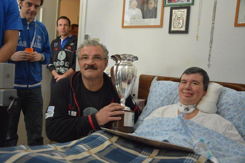 Sabato, quando sono entrati in casa, mi ha preso la tremarella. Meno male che devo stare immobile nel letto, altrimenti scatenavo un terremoto in tutta Sassari. Per primo è entrato Stefano con la coppa in mano e io ero già nell’iperuranio. Poi la mia amica Valentina, i “miei ragazzi” e tutto lo staff. Mentre si sistemavano, il presidente ha detto: «Ecco il tuo preferito», indicando il “capitano” Manuel Vanuzzo che è venuto verso di me e, col solito affetto, mi ha baciata (e qui ho fatto il giro dell’Universo un paio di volte). Quando sono atterrata ero in Paradiso perché mi sono accorta di avere nella mia stanza anche il più grande allenatore di tutti i tempi: Meo Sacchetti! No vabbè, così è troppo, ho pensato, ora mia scoppia il cuore.