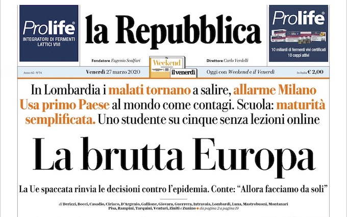 Ciò che colpisce, oggi, sono i commenti con cui si accompagnano le informazioni. Prendete ancora Repubblica: Stefano Folli che parla di una «Unione che è nel pieno di una crisi distruttiva» o, ancor di più, Massimo Giannini che scrive enfaticamente frasi come queste: «Tutti riconoscono l’emergenza umanitaria, sanitaria e finanziaria, ma non l’esigenza di una missione comune né l’urgenza di un’azione condivisa»; «la Storia li guarda, e loro si voltano dall’altra parte»; «imporre oggi [le regole sul deficit], di fronte alla macelleria sociale che il Covid-19 promette, è un atto di totale irresponsabilità. Di più: è quasi un crimine contro l’umanità». Letto su Repubblica e non sulla Padania, fa abbastanza impressione.