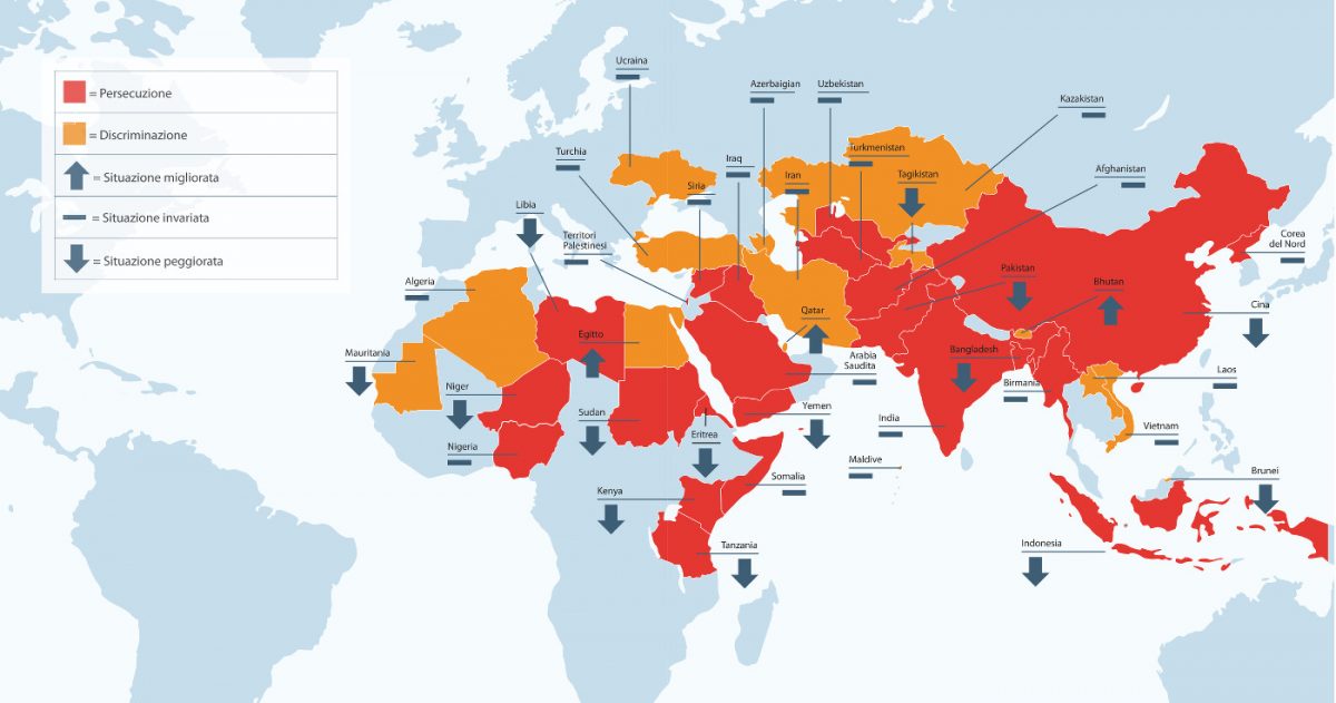 Qui sopra c’è la cartina che Aiuto alla Chiesa che soffre, benemerita fondazione pontificia, pubblica ogni anno nel suo Rapporto sulla libertà religiosa nel mondo (cliccare sull’immagine per ingrandirla). Le cose non vanno bene, come vedete. Esistono luoghi dell’orbe terracqueo dove professare il proprio credo significa subire angherie, torture, morte. Le statistiche ci dicono che, oggi, Anno Domini 2016, il cristianesimo è la religione più perseguitata al mondo. Ci sono situazioni – pensiamo all’Iraq o alla Siria, alla povera Asia Bibi al suo ottavo Natale in carcere – di cui, bene o male, più male che bene, i grandi media occidentali, pur a singhiozzo, trattano. Ve ne sono centinaia d’altre di cui non parla nessuno.