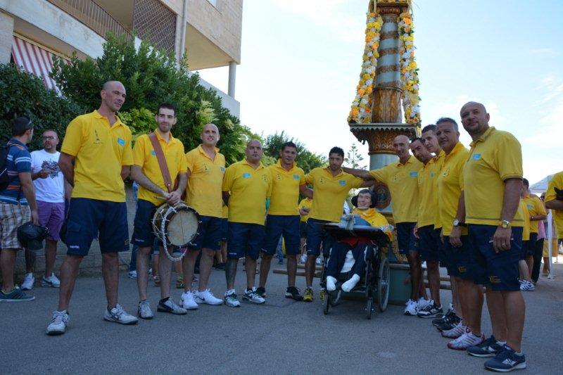Nel frattempo sono venuti Alessandro e Marco e mi hanno donato la maglia gialla del Gremio! Anche io, come tutti gli altri, ero “vestita di giallo”, diciamo che ero vestita, perché me l’hanno poggiata sopra, e non ho voluto che la togliessero nonostante ci fosse caldo, ma significava la “mia appartenenza” al Gremio dei sarti! Tra un addobbo e l’altro, ballavano davanti a me, con Alessandro che guidava il candeliere. Mi ha fatto un bellissimo regalo da prima invitandomi, e poi facendo ballare il candeliere davanti a me. Ero in estasi dalla felicità, e pensavo che un sogno inatteso si era realizzato, non è vero che chi è malato deve rinunciare a tutto, la vita ci riserva altre sorprese!
