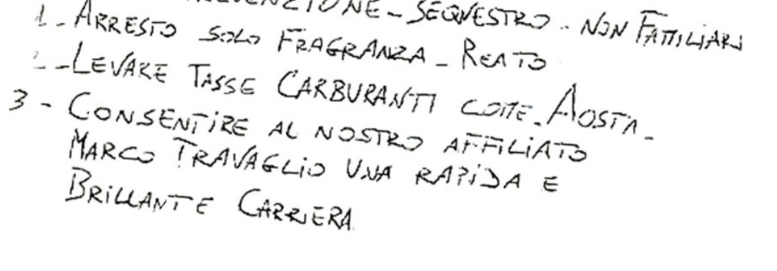 TRAVAGLIO AL PUNTO 13. Proprio per dimostrare l’infondatezza di questo verdetto di Travaglio, invece, l’autore di questo libro si lancia in un simpatico giochino. Caladejo riproduce un papello identico a quello ora agli atti del processo, con l’aggiunta di una tredicesima, fintissima, richiesta mafiosa: «Consentire al nostro affiliato Marco Travaglio una rapida e brillante carriera». Scrive l’autore: «La forma corrisponderebbe esattamente a quella del papello oggi in atti, così come confermata dalla polizia scientifica: fotocopia fatta con carta vecchia e toner vecchio, l’originale l’avrebbe scritto un tizio su dettatura».