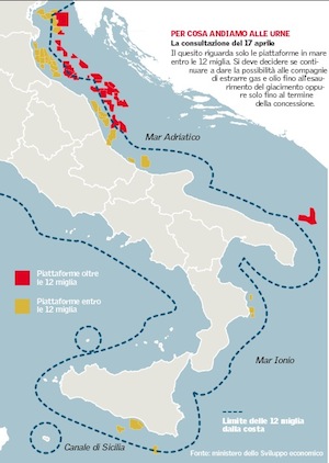 Un passo indietro. Il referendum è stato ottenuto, per la prima volta in Italia, non attraverso la raccolta di 500 mila firme, ma per la richiesta di dieci Regioni: Abruzzo (poi ritiratasi), Basilicata, Calabria, Campania, Marche, Molise, Puglia, Sardegna, amministrate dalla sinistra, Liguria e Veneto, dal centrodestra. Dall’elenco manca l’Emilia-Romagna cioè la regione dove sono situate la maggior parte delle piattaforme. Fra i richiedenti vi è, invece, la Puglia il cui governatore, Michele Emiliano, è il più accanito sostenitore del voto no-triv, sebbene nel suo mare non vi sia nemmeno una piattaforma entro le 12 miglia.